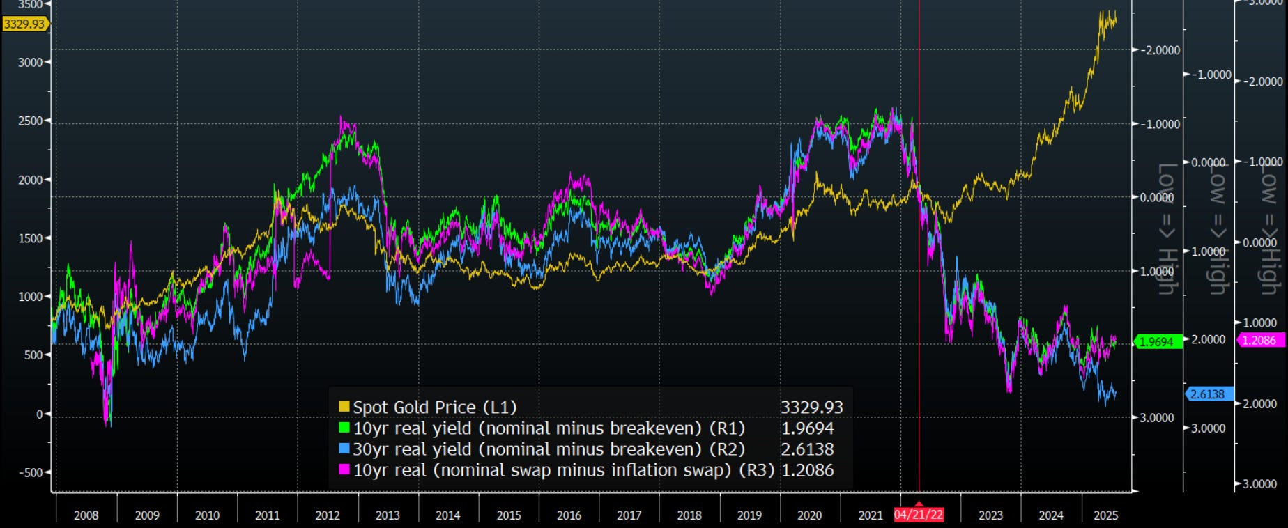 I am always intrigued when a long-held relationship breaks down. The one everyone knows well by now is when gold broke from US real yields after the Russian invasion of Ukraine and the US confiscated Russian reserves, forcing a flight by central banks not aligned with US priorities (real rates are inverted on the right axis, so gold is implying more than 2% negative real rates):