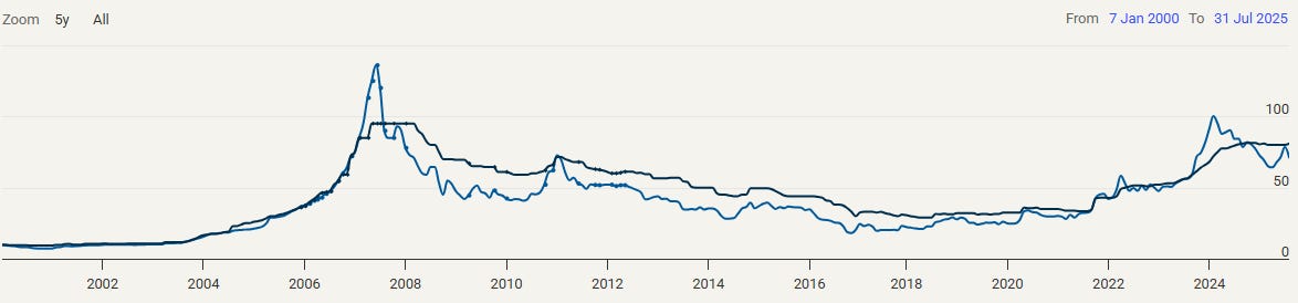For context, this is what the uranium spot (light blue) and term price (dark blue) has done since 2000: